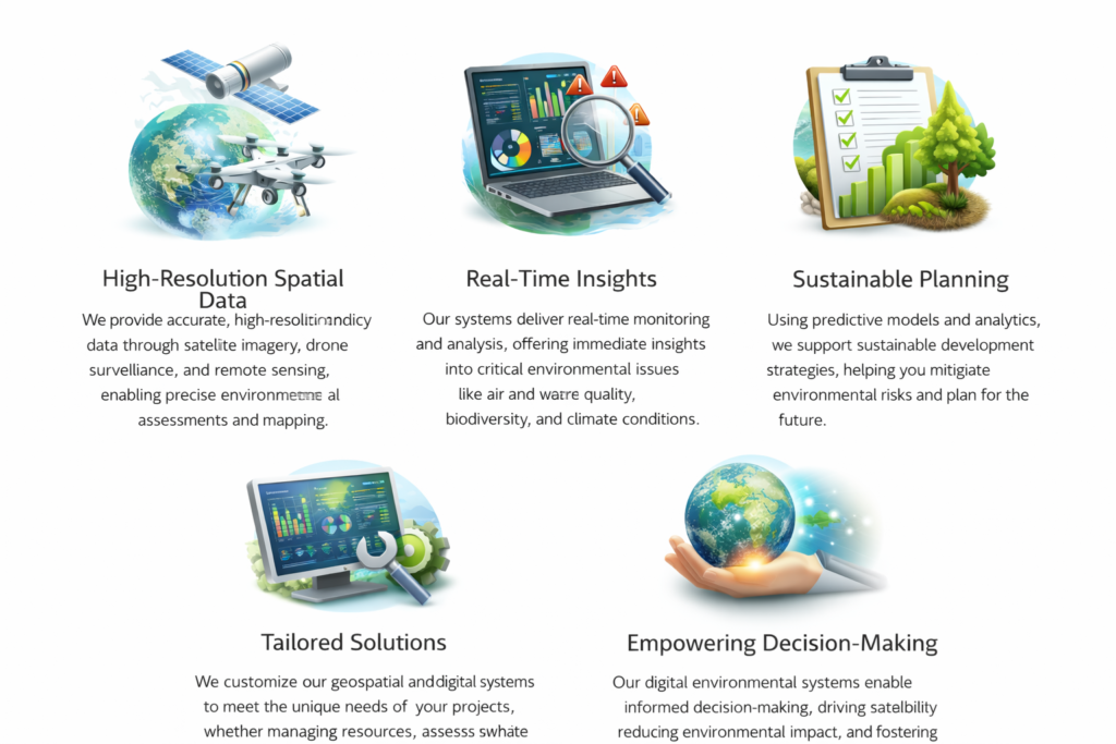 We integrate the power of satellite imagery, GIS mapping, drone technology, and real-time environmental monitoring to offer precise, actionable data for sustainability and conservation efforts. By combining advanced spatial analysis with environmental systems, we help businesses and organizations understand and manage their environmental footprint more effectively.